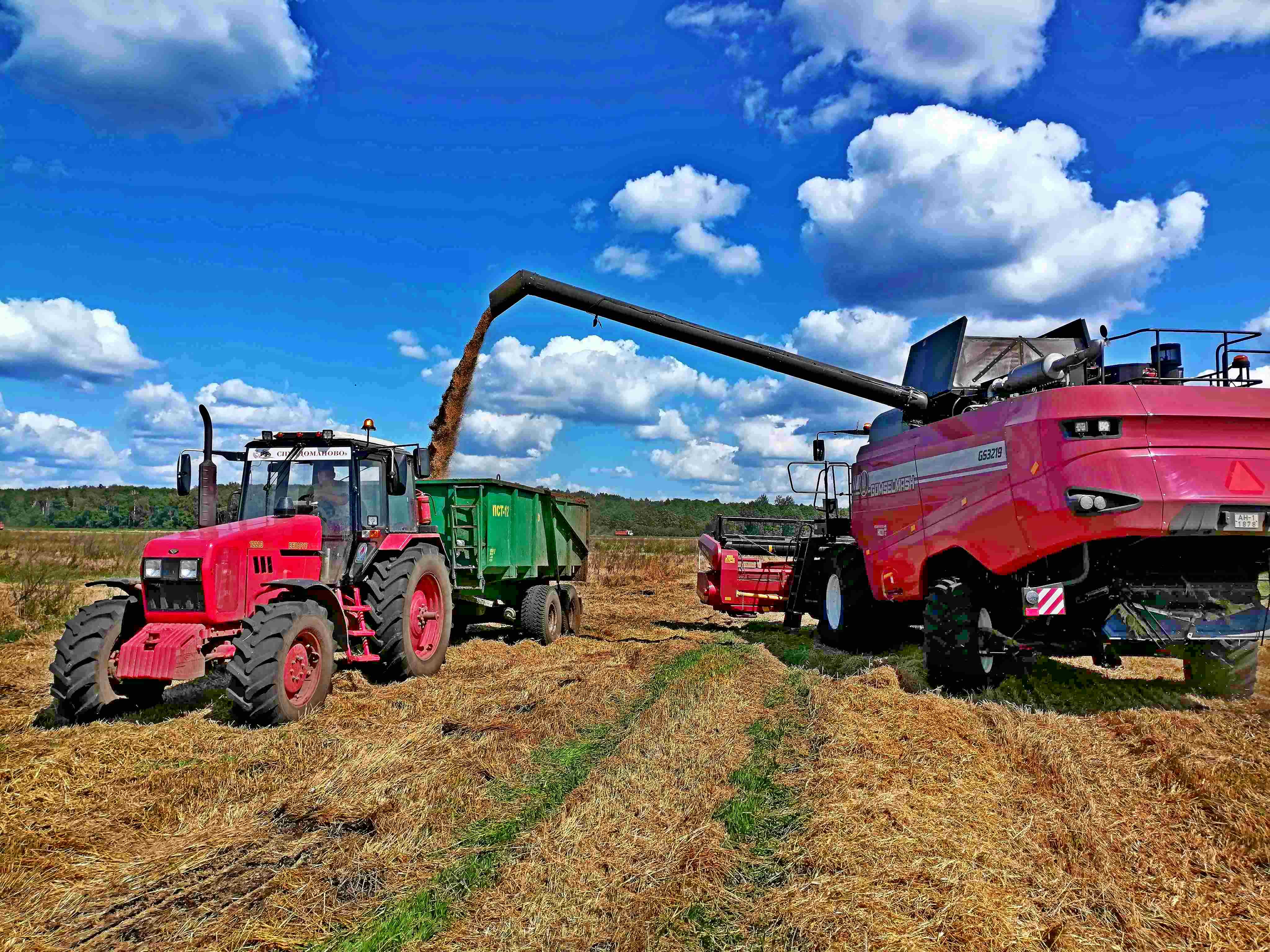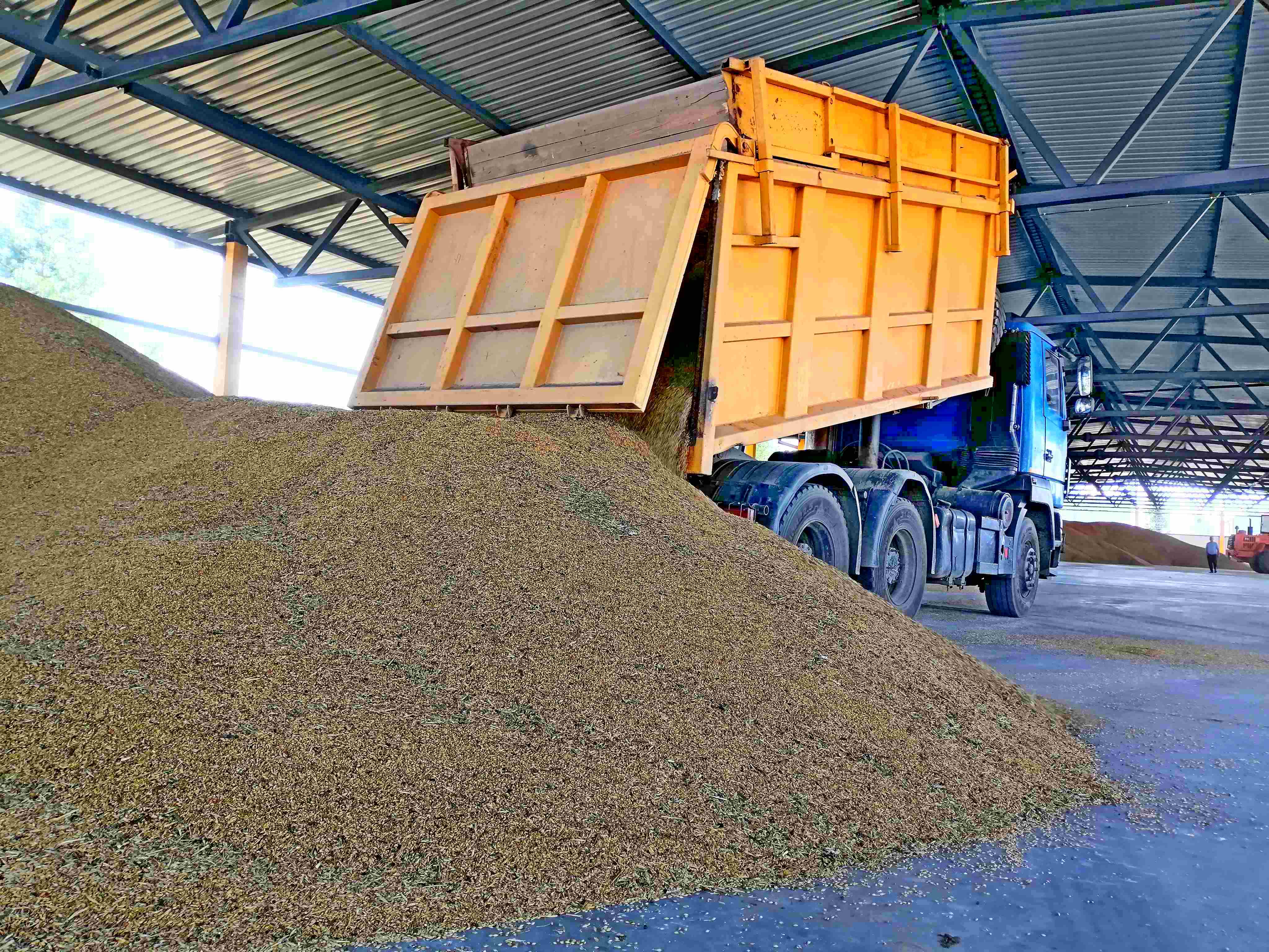 Собранное зерно, насыщенное питательными веществами благодаря обработке Гумат Рост, высыпается в грузовики для транспортировки. Высокое качество зерна позволяет ожидать отличные результаты при его дальнейшем использовании и переработке.